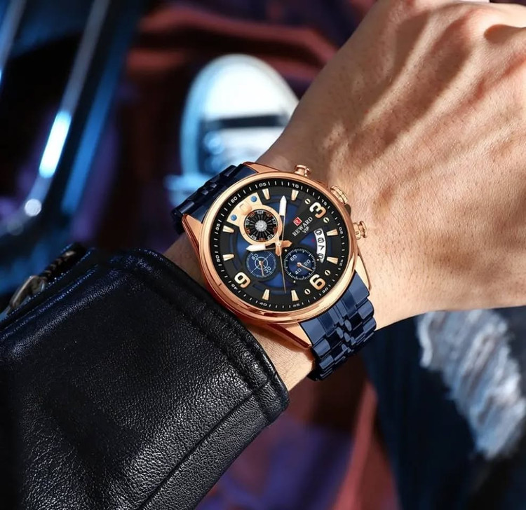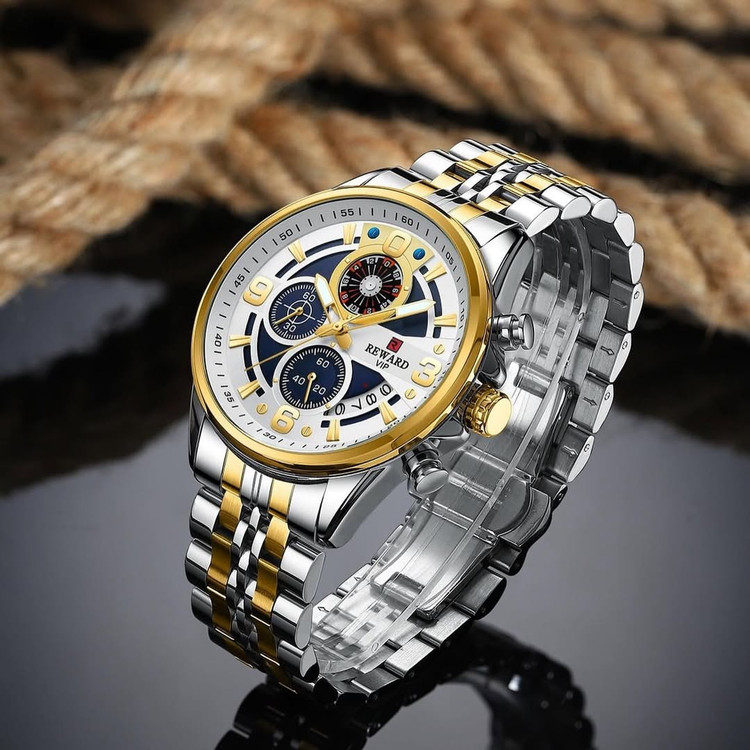 REWARD 81057 با طراحی کلاسیک و مدرن ترکیب شده است. قاب و بند استیل ضد زنگ، رنگ ثابت و لوگوی درجشده روی قاب و قفل، جلوهای لوکس و شیک به ساعت میدهد. شیشه هار دلکس منحنی علاوه بر زیبایی، مقاومت بالایی در برابر ضربه و خش دارد. طراحی سه موتوره و کرنوگراف آن باعث میشود ساعت هم برای استفاده روزمره و هم موقعیتهای رسمی مناسب باشد.