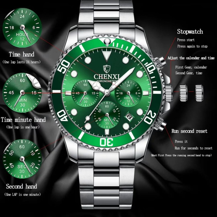 ساعت CHENXI 901 به سه موتور فعال مجهز است که تمامی آنها عملکرد واقعی دارند و دقت بالایی در نمایش زمان ارائه میدهند. این ساعت امکاناتی نظیر کرنومتر، تقویم روزانه و نمایش AM/PM را در اختیار شما قرار میدهد تا در هر موقعیت، زمان را دقیق و حرفهای مدیریت کنید.