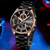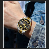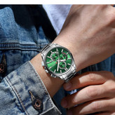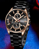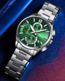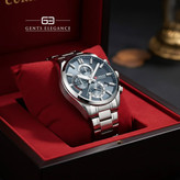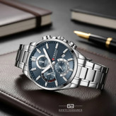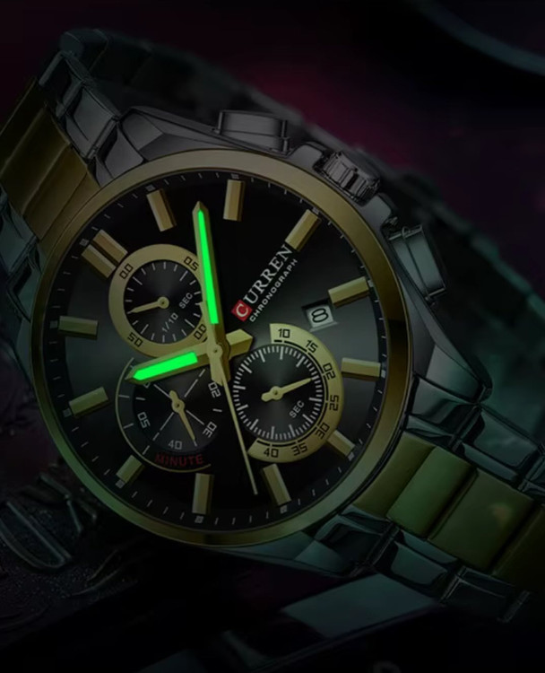 مدل 8475 از آن دسته ساعتهایی است که در همان نگاه اول توجه شما را جلب میکند. صفحه ۴۴ میلیمتری با طراحی چندلایه، سابدایالهای دقیق و ترکیب رنگهای جذاب (طلایی، نقرهای، مشکی، رزگلد و سرمهای) جلوهای خاص و مردانه به این ساعت داده است. قاب استیل با پرداخت براق و مات، در کنار بند استیل محکم، حس یک ساعت لوکس و گرانقیمت را منتقل میکند.