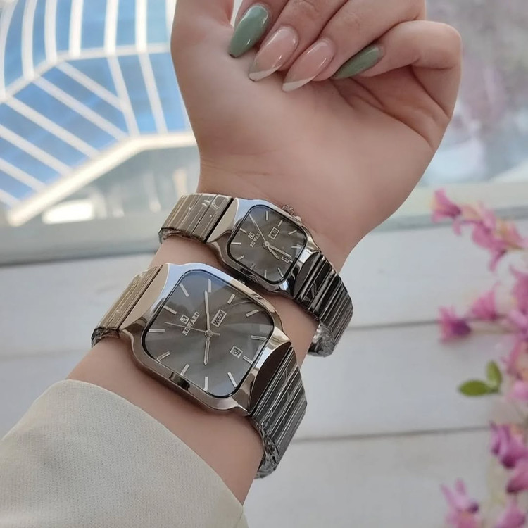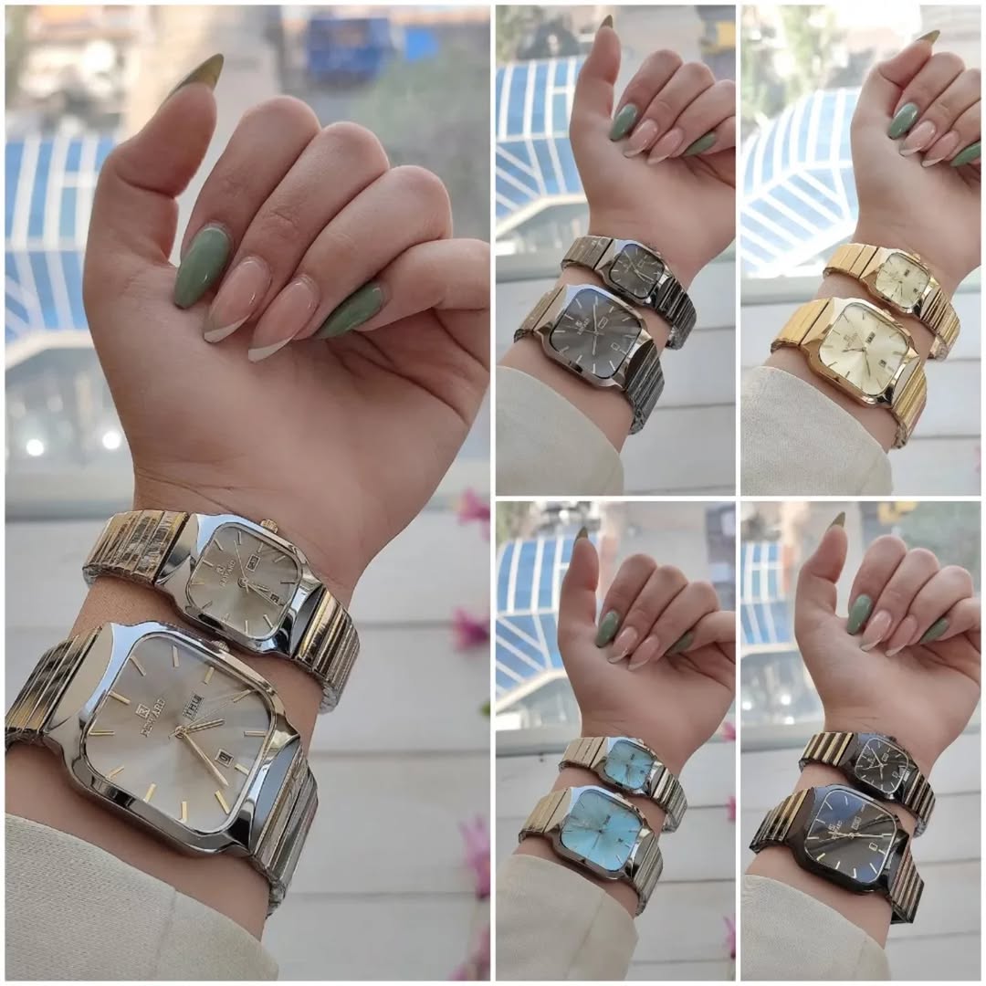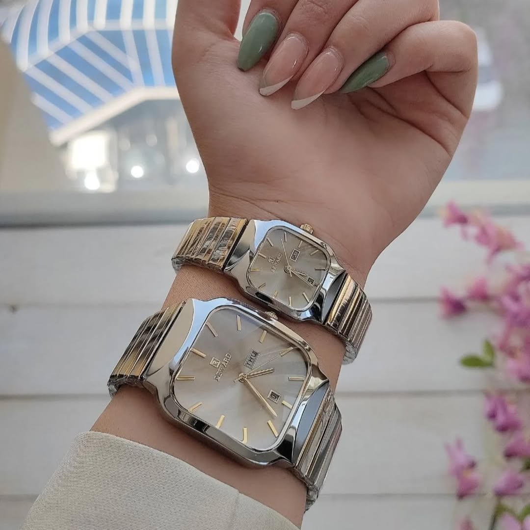 طراحی هماهنگ نسخه مردانه و زنانه، مهمترین ویژگی این ست است. قاب با خطوط نرم و حسابشده، صفحهای تمیز و حرفهای و بند استیل با کیفیت بالا، ظاهری لوکس و کاملاً VIP به این مدل میبخشد. استفاده از رنگهای لاکچری مانند مشکی براق، نقرهای درخشان، طلایی کلاسیک و سبز تیره، این ساعت را به گزینهای ایدهآل برای استایلهای رسمی و روزمره تبدیل کرده است.