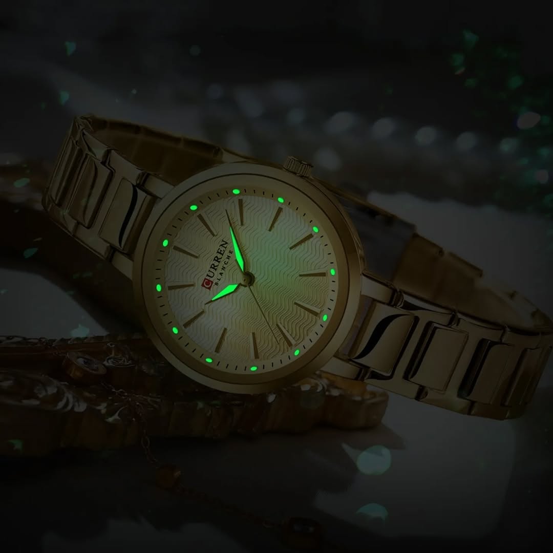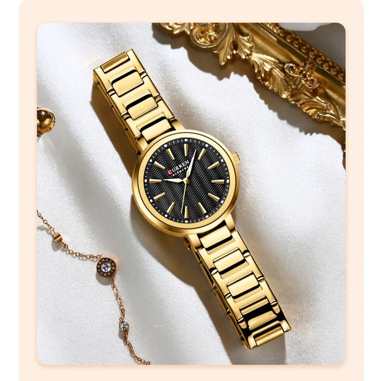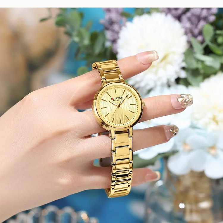 ساعت زنانه CURREN 9109 با طراحی مینیمال اما چشمنواز، بهراحتی با استایل رسمی، اسپرت و مجلسی ست میشود. رنگ طلایی جذاب، جلوهای لوکس به دستان شما میبخشد و توجهها را بهسوی شما جلب میکند.
