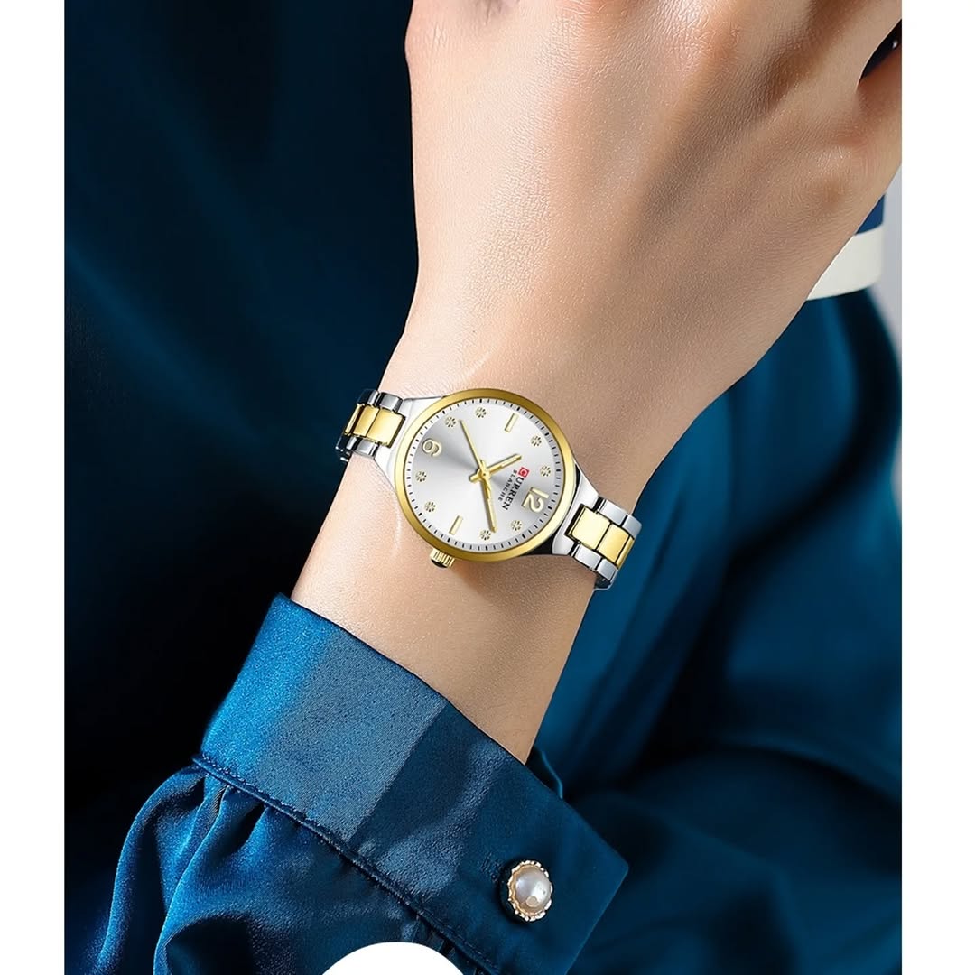 ساعت مچی زنانه کارن مدل CURREN 9105 یکی از ظریفترین و خوشساختترین مدلهای کالکشن جدید برند CURREN است که با طراحی جذاب، شیک، ساده و اصیل، برای بانوانی طراحی شده که به جزئیات اهمیت میدهند. این ساعت ترکیبی متعادل از زیبایی، کیفیت و کارایی بوده و میتواند بهراحتی با استایل روزمره، رسمی و حتی مجلسی ست شود.