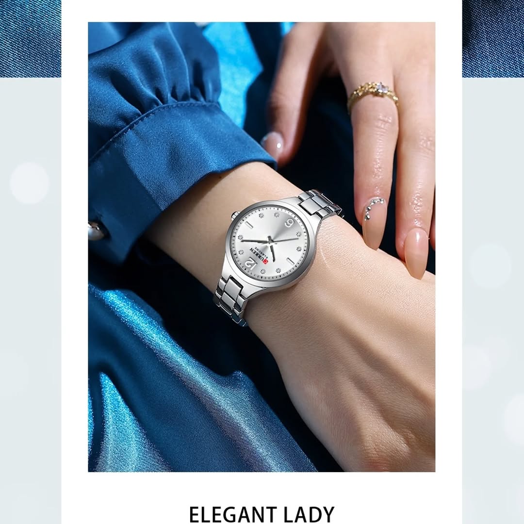 قاب این ساعت از آلیاژ ضد حساسیت ساخته شده که برای پوستهای حساس کاملاً مناسب بوده و امکان استفاده طولانیمدت را بدون ایجاد ناراحتی فراهم میکند. این ویژگی برای ساعتهای زنانه اهمیت بالایی دارد و نشاندهنده توجه برند CURREN به جزئیات است.