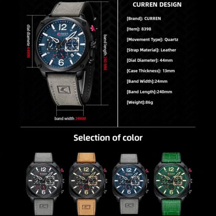 ساعت مچی مردانه کارن مدل **CURREN 8398** یکی از مدلهای محبوب و شیک این برند است. این ساعت دارای ویژگیهای زیر است: - **طراحی زیبا و اسپرت**: این ساعت با ترکیب رنگهای خاکستری و مشکی، ظاهری مدرن و جذاب دارد که مناسب استفاده روزمره و مجالس رسمی است². - **سه موتور فعال**: این ساعت دارای سه موتور فعال است که علاوه بر نمایش زمان، قابلیت نمایش 24 ساعته و تاریخ شمار را نیز دارد². - **جنس بند و قاب**: بند این ساعت از جنس چرم با کیفیت و قاب آن از جنس استیل ضد زنگ ساخته شده است که دوام و مقاومت بالایی دارد². - **مقاومت در برابر آب**: این ساعت دارای مقاومت در برابر آب تا عمق 30 متر (3ATM) است که آن را برای استفاده روزمره مناسب میکند². - **شیشه معدنی مقاوم**: شیشه این ساعت از جنس معدنی مقاوم در برابر خش است که از صفحه نمایش آن محافظت میکند². این ساعت با قطر صفحه 44 میلیمتر و ضخامت قاب 13 میلیمتر، وزن 86 گرم دارد و با قفل بند سگکی عرضه میشود².