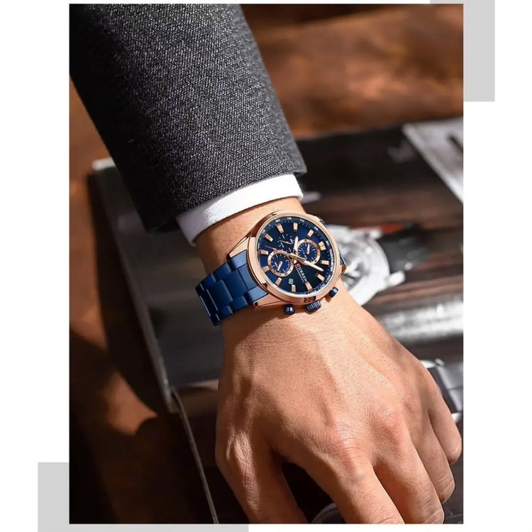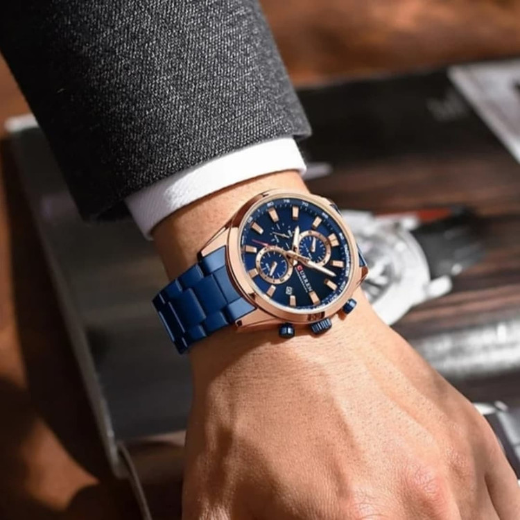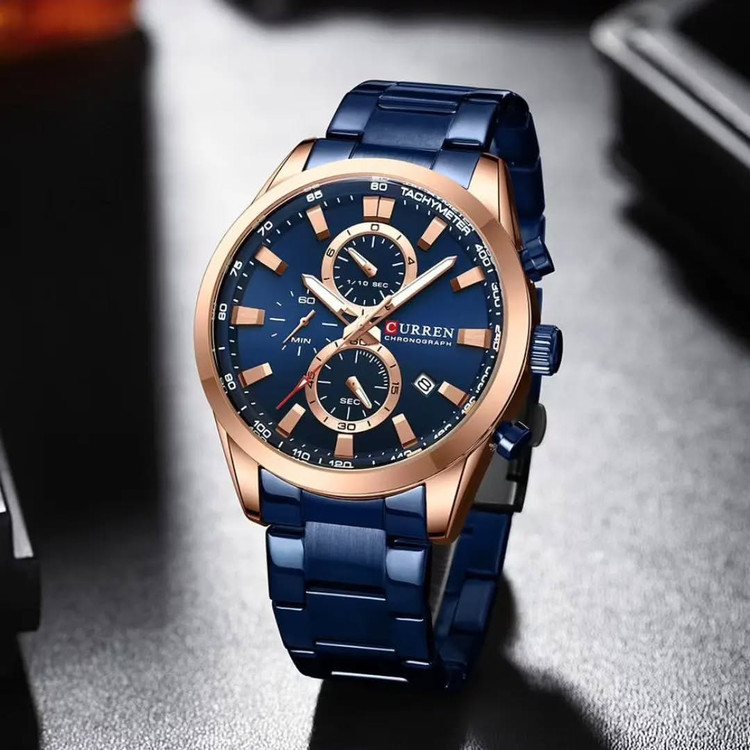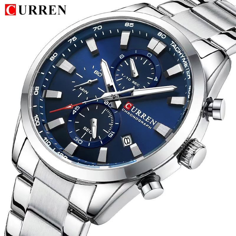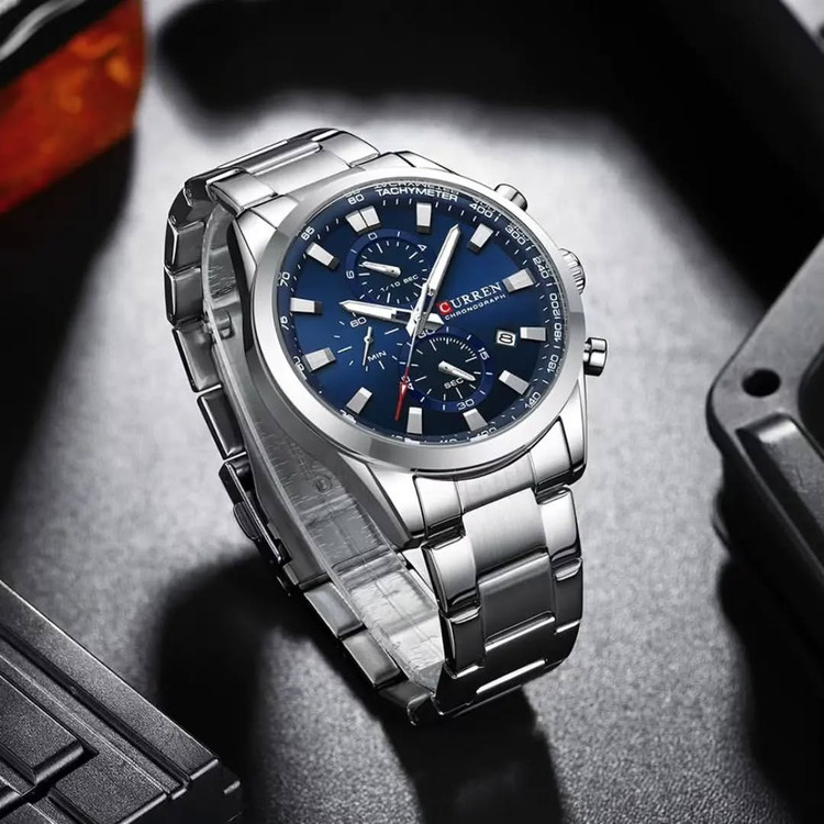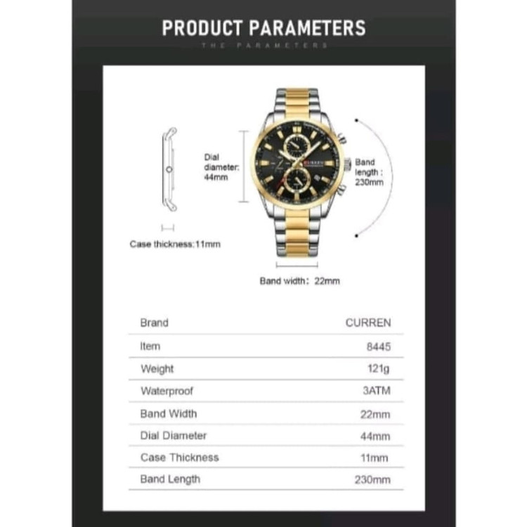 ساعت مچی مردانه **CURREN 8445** با بند فلزی، یک انتخاب ایدهآل برای افرادی است که به دنبال ترکیبی از **طراحی شیک، دوام بالا و عملکرد دقیق** هستند. این مدل با الهام از ساعتهای اسپرت و کلاسیک، ظاهری لوکس و مدرن دارد که برای استفاده روزمره و همچنین موقعیتهای رسمی مناسب است. ### **مشخصات کلی ساعت CURREN 8445** ✅ **نوع موتور:** کوارتز ژاپنی با دقت بالا ✅ **نوع نمایشگر:** آنالوگ ✅ **قطر صفحه:** ۴۴ میلیمتر ✅ **ضخامت صفحه:** ۱۱ میلیمتر ✅ **جنس بند:** استیل ضدزنگ (Stainless Steel) ✅ **طول بند:** ۲۳۰ میلیمتر | **عرض بند:** ۲۲ میلیمتر ✅ **جنس شیشه:** هاردلکس (مقاوم در برابر خط و خش) ✅ **ویژگیهای اضافی:** - دارای **کرنوگراف فعال** با سه صفحه کوچک برای اندازهگیری زمان - نمایشگر **تاریخ** ✅ **مقاومت در برابر آب:** **۳۰ متر (۳ATM)** – مقاوم در برابر پاشش آب، اما مناسب برای شنا و غواصی نیست ✅ **رنگبندی:** نقرهای، مشکی، آبی، طلایی و ترکیبی ### **چرا ساعت CURREN 8445؟** ✔ **کیفیت بالا در برابر قیمت مقرونبهصرفه** ✔ **موتور ژاپنی با دقت عالی و عمر طولانی** ✔ **مناسب برای استایل رسمی و روزمره** ✔ **مقاومت خوب در برابر آب و خط و خش**