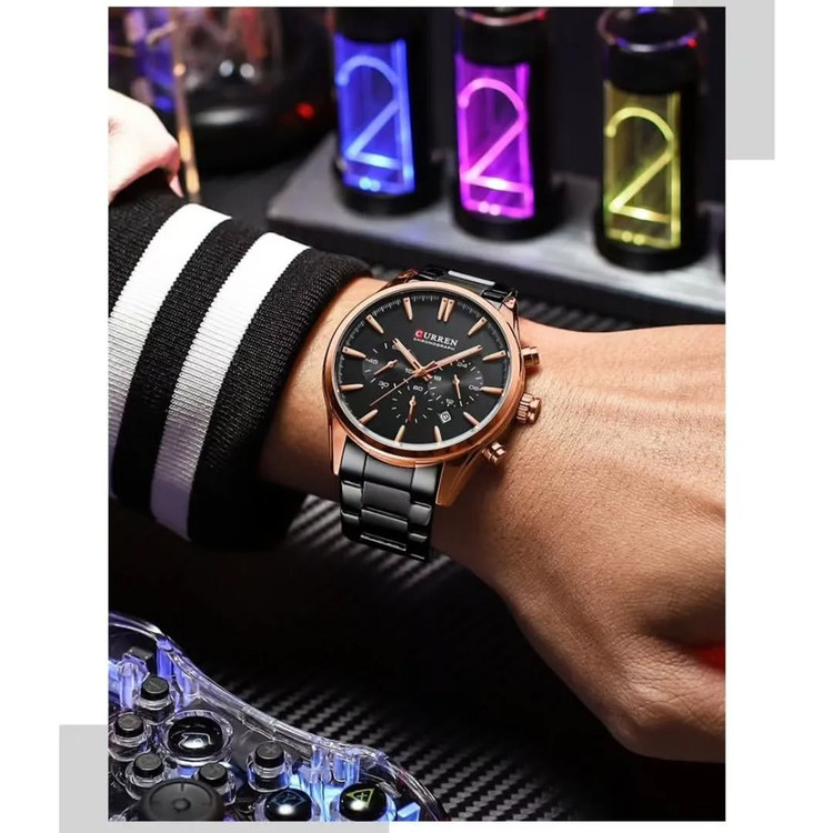 ساعت **CURREN 8446** یک ساعت مردانه با طراحی کلاسیک و مدرن است که به دلیل کیفیت ساخت بالا و قیمت مناسب، طرفداران زیادی دارد. در ادامه مشخصات کامل این مدل را بررسی میکنیم: ### **مشخصات کلی CURREN 8446:** - **برند:** CURREN - **مدل:** 8446 - **نوع کاربری:** روزمره، رسمی و اسپرت - **موتور:** کوارتز با دقت بالا - **ویژگیها:** دارای کرنوگراف (سه عقربه کوچک فعال) و نمایش تاریخ ### **مشخصات فیزیکی:** - **جنس بدنه:** آلیاژ روی (Zinc Alloy) با روکش مقاوم - **جنس بند:** استیل ضد زنگ (Stainless Steel) - **عرض بند:** حدود 22 میلیمتر - **قطر صفحه:** 44 میلیمتر - **ضخامت بدنه:** 12 میلیمتر - **وزن:** تقریبی و متناسب با ساختار فلزی - **نوع قفل:** کلیپسی با محافظ ### **ویژگیهای عملکردی:** - **مقاومت در برابر آب:** 3ATM (مقاوم در برابر پاشش آب و شستوشوی دست، اما مناسب برای شنا یا حمام نیست) - **صفحه نمایش:** عقربهای با طراحی خوانا و نشانگرهای درخشان برای دید در شب - **کرنوگراف:** دارای سه صفحه فرعی فعال برای اندازهگیری ثانیه، دقیقه و ساعت کرنوگراف ### **رنگبندی:** CURREN 8446 در چندین رنگ مختلف عرضه شده است، از جمله: - مشکی با جزئیات طلایی - نقرهای با صفحه مشکی - تمام مشکی - ترکیب آبی و نقرهای ### **مناسب برای:** این مدل به دلیل طراحی زیبا و ترکیب رنگهای جذاب، برای استفادههای رسمی، جلسات کاری و حتی استایلهای روزمره و اسپرت مناسب است.